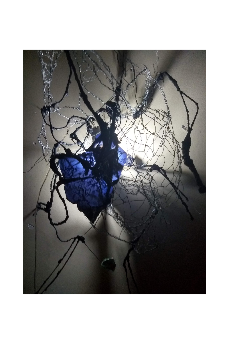 Desenho articulado em arame galvanizado, tecido sintético, acrílico modelado, alumínio e lâmpada LED. Se ajusta ao espaço, formando múltiplas sombras mutáveis